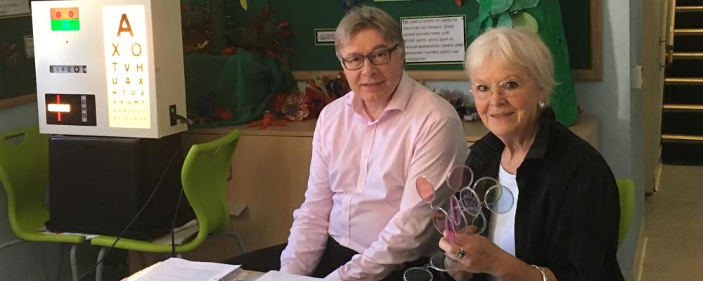 Geraint Griffiths and Freda Storey holding Eye Bright Test lorgnettes.